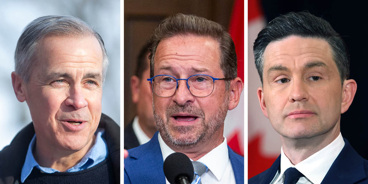 Quebec polls have recently shifted for the parties of Liberal leadership candidate Mark Carney, left, Bloc Québécois Leader Yves-François Blanchet, and Conservative Leader Pierre Poilievre.
