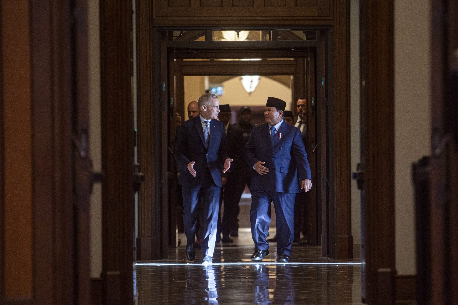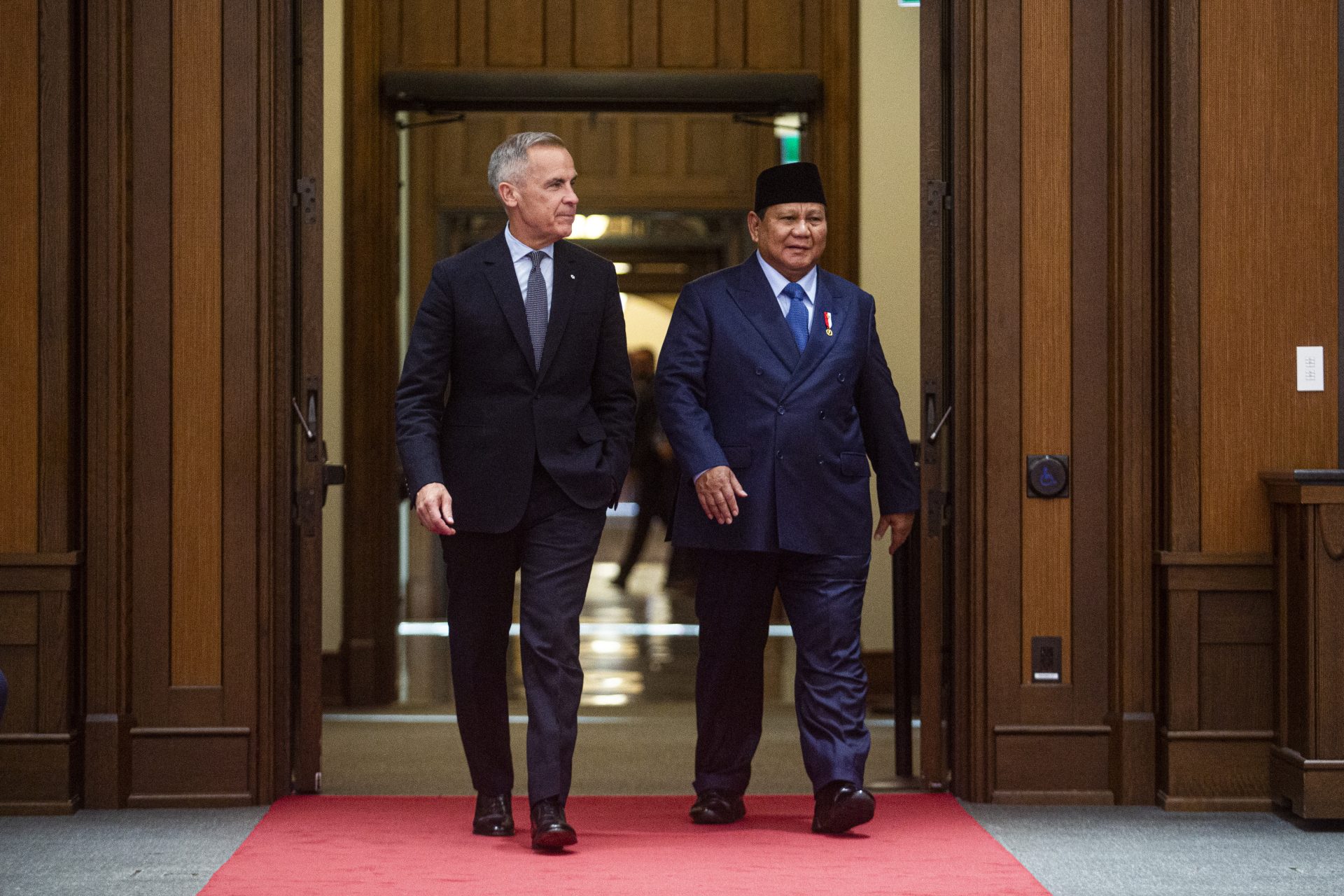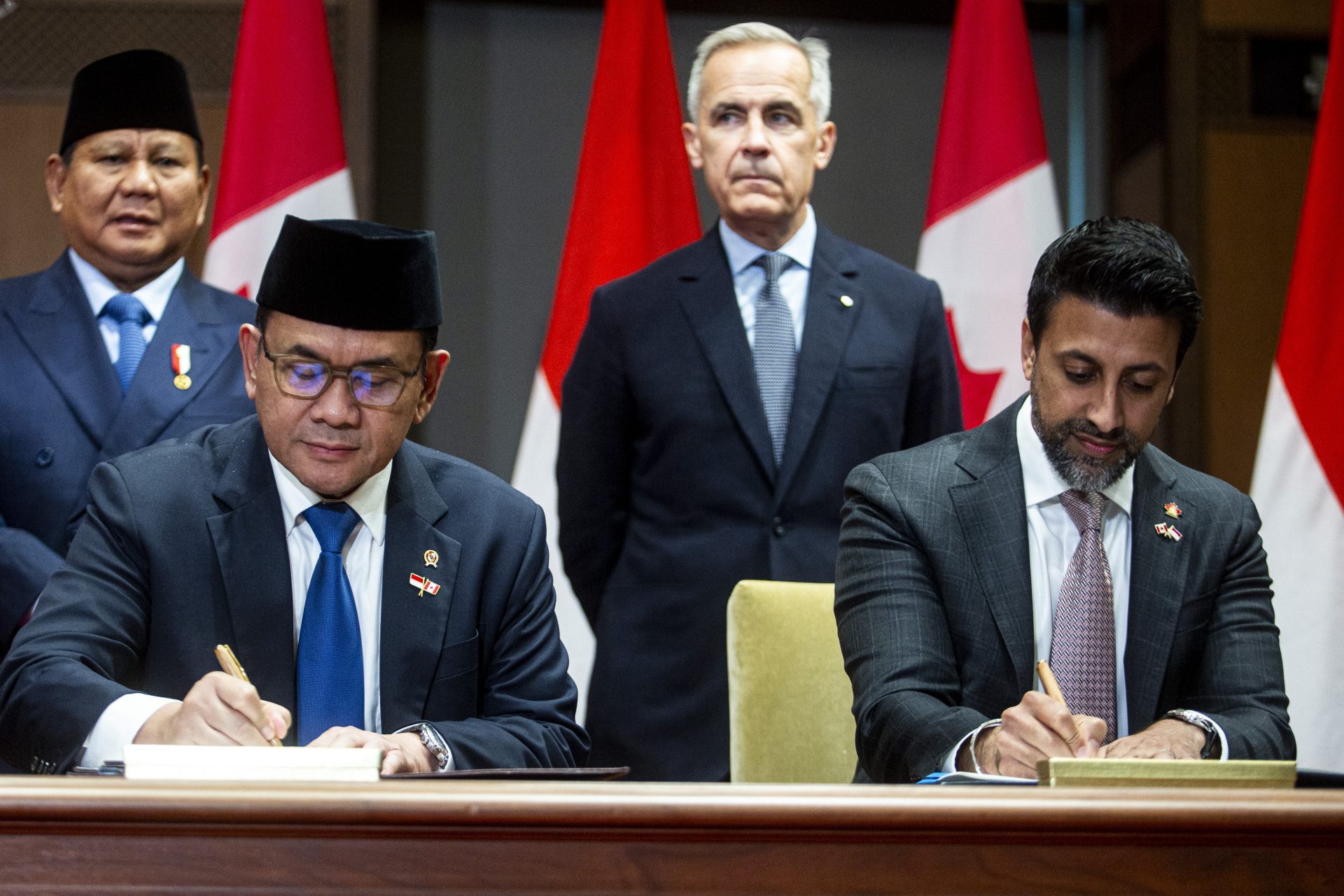 Prime Minister Mark Carney welcomes Indonesian President Prabowo Subianto to West Block on Sept. 24, 2025, for a working visit to sign a comprehensive economic partnership agreement and defence co-operation agreement. The Hill Times photograph by Andrew MeadeThe Canada-Indonesia Comprehensive Economic Partnership Agreement (CEPA) represents a first-ever bilateral trade agreement with a member of the Association of Southeast Asian Nations. The two also signed a Defence Cooperation Agreement, building on the Military Cooperation Memorandum of Understanding signed last month, according to the Prime Minister’s Office. The Hill Times photograph by Andrew MeadeCarney called it a ‘game-changing’ agreement, while a PMO release said it would open new opportunities for those working in the clean technology, agri-food, infrastructure, critical minerals, and financial services sectors. The Hill Times photograph by Andrew MeadeThe joint statement from Subianto, pictured, and Carney said the CEPA would be a ‘platform to strengthen trade and investment ties, expand business opportunities, and foster co-operation in key areas. The Hill Times photograph by Andrew MeadeIndonesian Minister of Trade Budi Santoso and Canada’s International Trade Minister Maninder Sidhu take part in a signing ceremony. The Hill Times photograph by Andrew MeadeIndonesian Minister of Investment Rosan Perkasa Roeslani and National Defence Minister David McGuinty take part in a signing ceremony. In a statement, McGuinty pointed to Canada’s Indo-Pacific Strategy, saying the ‘region will play a critical role in shaping Canada’s future over the next half-century.’ The Hill Times photograph by Andrew MeadeBusiness Council of Canada President Goldy Hyder took part in he signing ceremony. The Hill Times photograph by Andrew MeadeCarney and Subianto tasked their respective foreign ministers with finalizing ‘as soon as possible, a 2026-2029 Canada-Indonesia Plan of Action to ‘provide a roadmap for a strategic, forward-looking, and outcome-oriented co-operation across the three main pillars: economic partnership, defense and political co-operation, and people-to-people ties’ according to the joint statement. The Hill Times photograph by Andrew Meade