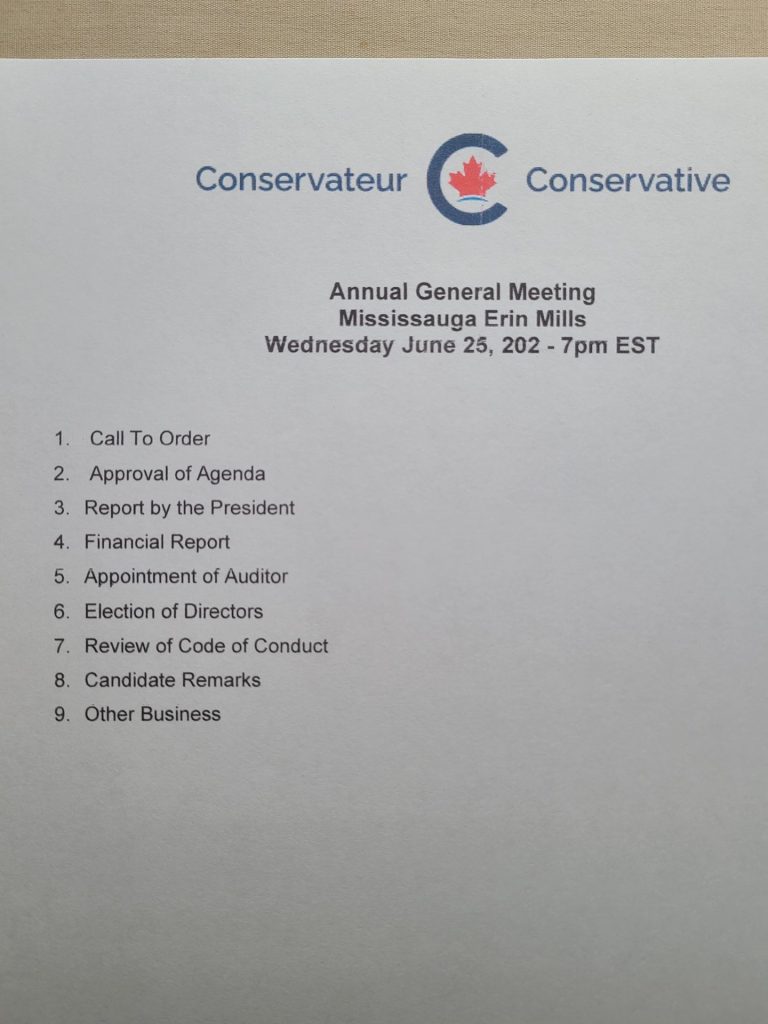 The Hill Times obtained a copy of the meeting agenda, printed on official party letterhead. It lists nine items, including a call to order, approval of agenda, report by the president, financial report, appointment of auditor, election of directors, review of code of conduct, candidate remarks, and other business.
