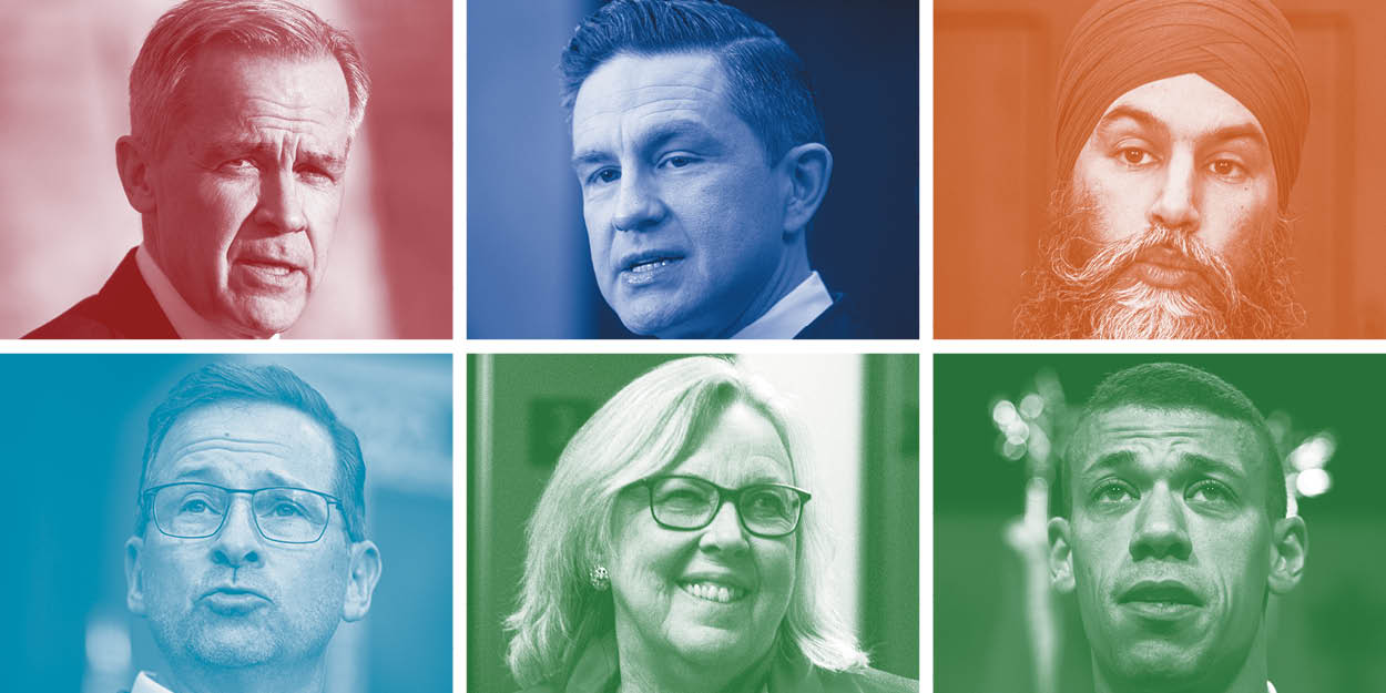 Prime Minister Mark Carney, left, Conservative Leader Pierre Poilievre, NDP Leader Jagmeet Singh, Bloc Québécois Leader Yves-François Blanchet, and Green Party co-Leaders Elizabeth May and Jonathan Pedneault.