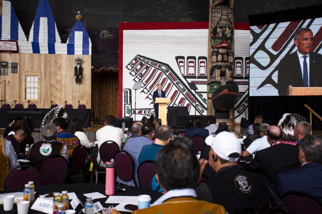 Carney promised approved nation-building development projects would take place in collaboration with Indigenous communities in his remarks at the two-day gathering, pledging to build projects “with” Indigenous nations, and saying that the “economic value” generated by the projects built “will be shared with First Nations as partners.”