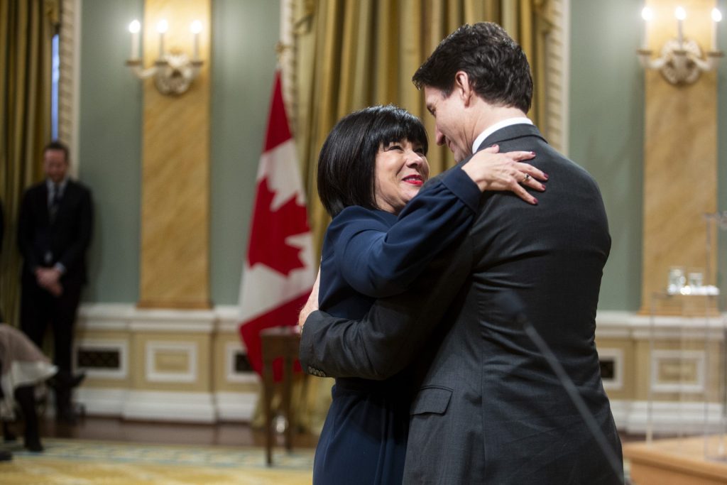 Minister Ginette Petitpas Taylor, left, hugs Prime Minister Justin Trudeau at the cabinet shuffle made her president of the Treasury Board on Dec. 20, 2024. The Hill Times photograph by Andrew Meade