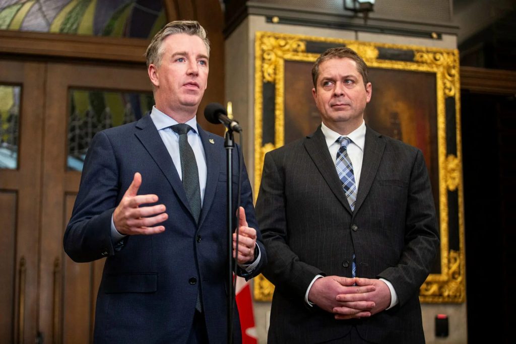Conservative MP Michael Barrett, left, with Conservative House Leader Andrew Scheer. Barrett has raised a privilege motion concerning ethical questions surrounding Employment Minister Randy Boissonnault. The Hill Times photograph by Andrew Meade