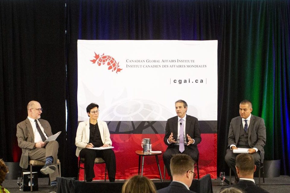 Chris Zimmer, chief of digital transformation at National Defence, left, assistant deputy ministers Nancy Tremblay and Simon Page, and defence procurement expert Richard Shimooka speak at the CGAI conference on Nov. 25. The Hill Times photograph by Andrew Meade