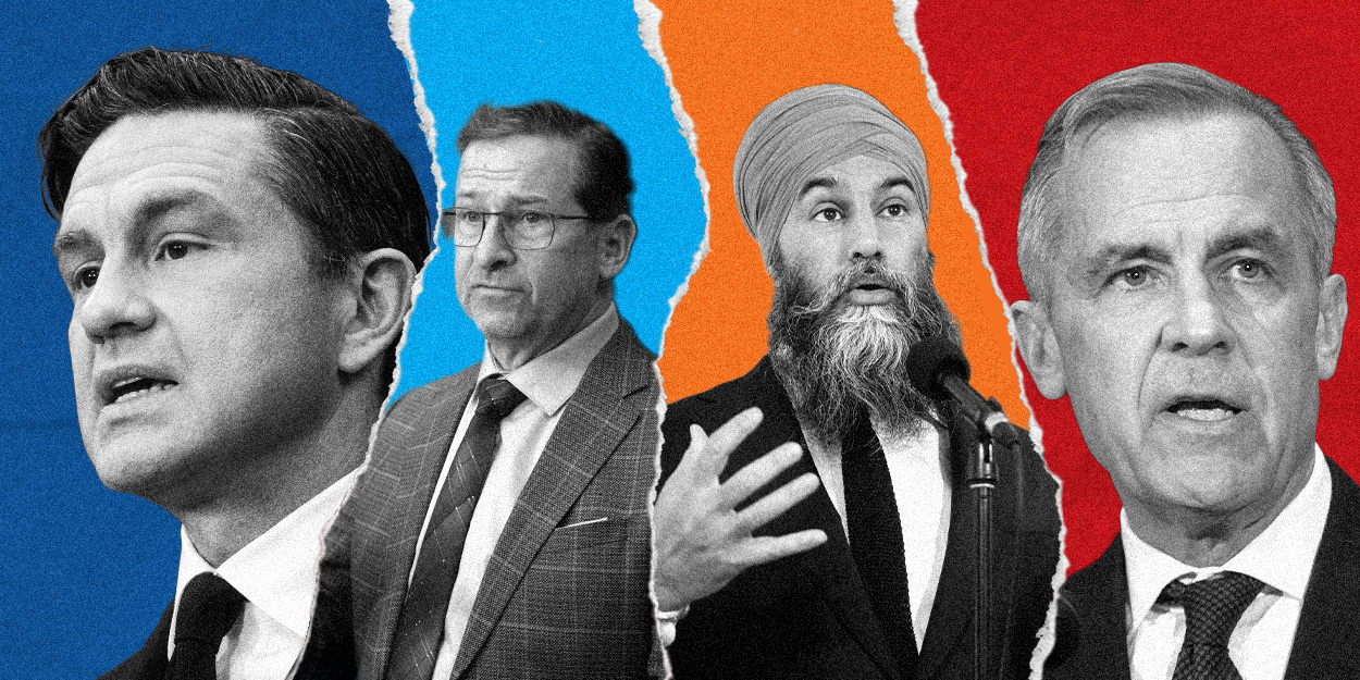 Conservative Leader Pierre Poilievre, left, Bloc Québécois Leader Yves-François Blanchet, NDP Leader Jagmeet Singh, and Prime Minister Mark Carney.The Hill Times photographs by Andrew Meade and illustration by Naomi Wildeboer