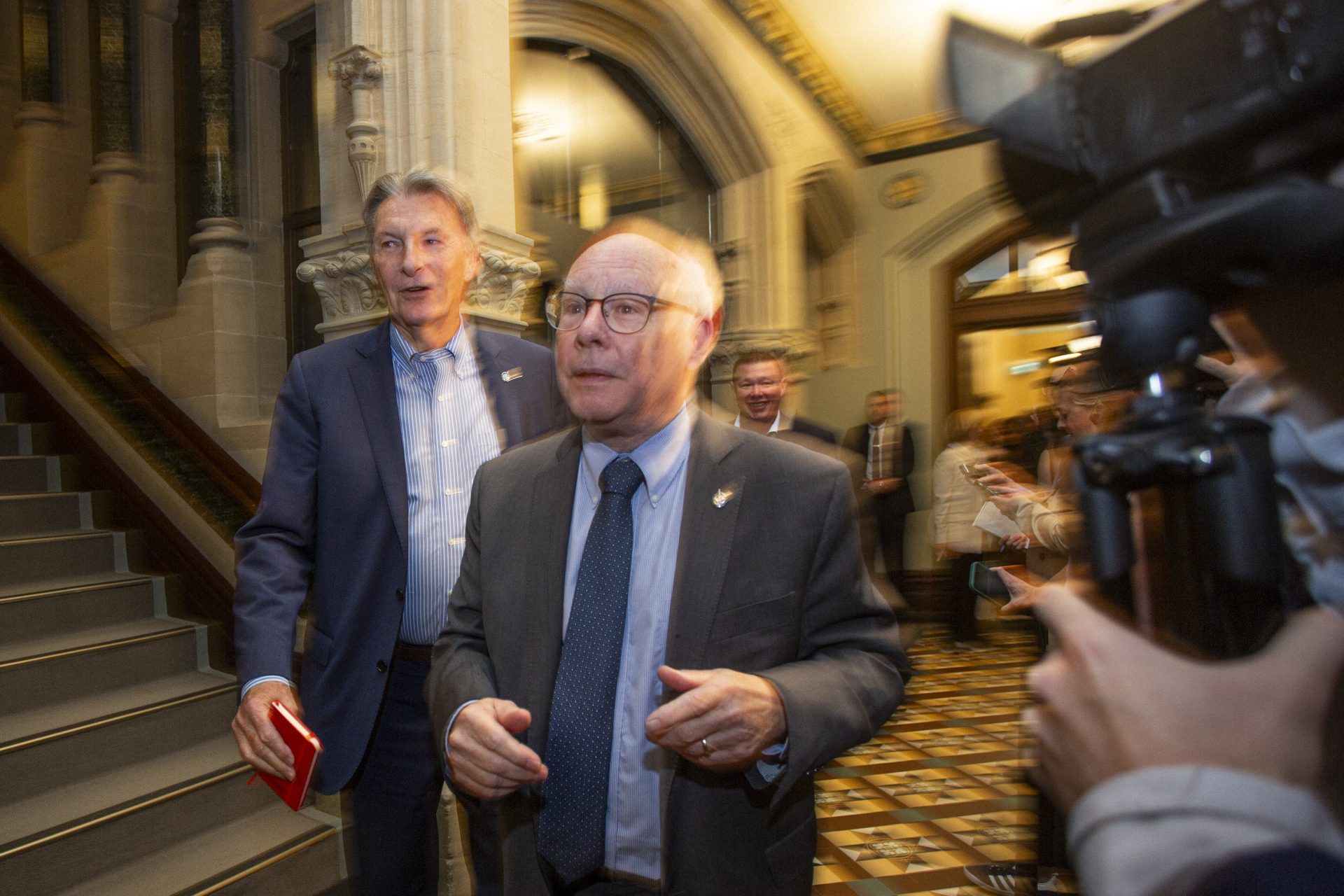 Liberal MPs Ken Hardie, right, and John McKay arrive for the caucus meeting. McKay previously told The Hill Times that, had the Liberals adopted a Reform Act measure granting caucus the power to vote on their leader, “it would have given everybody at least a format for the issue that seems to be at hand.”