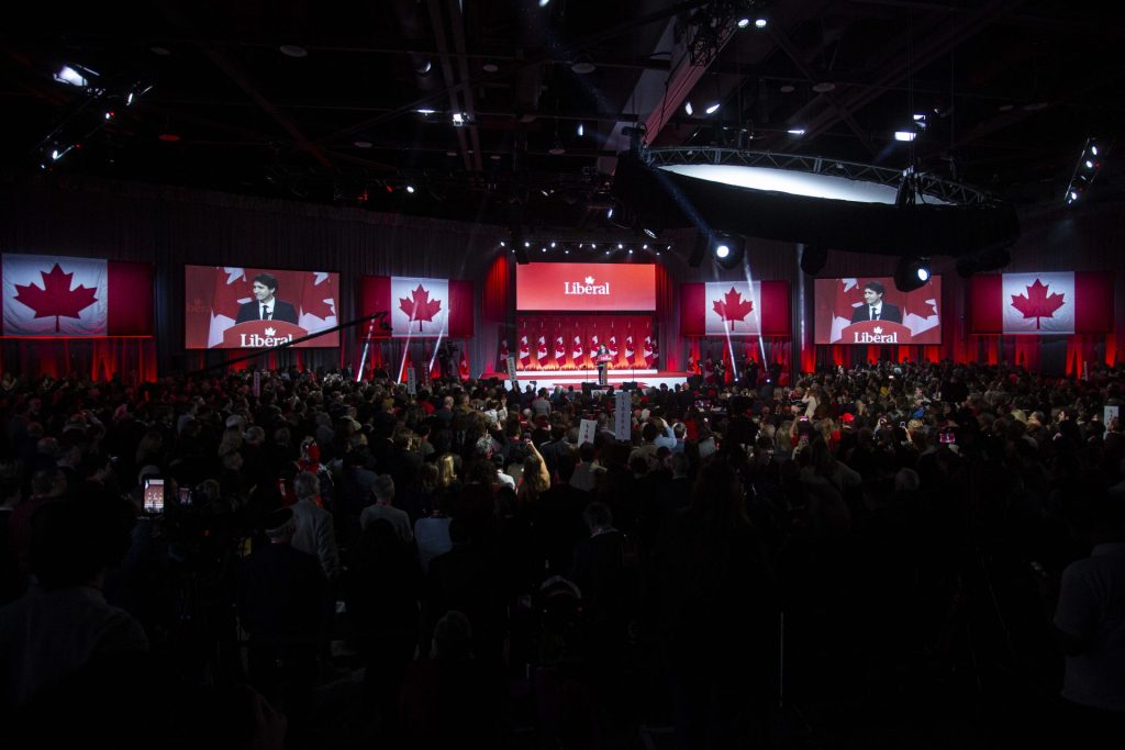 Trudeau tells supporters gathered ahead of the results that it is time for Liberals to fight as Canada faces a ‘nation-defining moment’ with the threat posed by America’s trade war. The Hill Times photograph by Andrew Meade