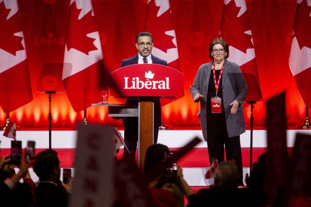 Sachit Mehra, Liberal Party of Canada president, left, announced Carney as the party’s next leader to cheers from the crowd. The Hill Times photograph by Andrew Meade