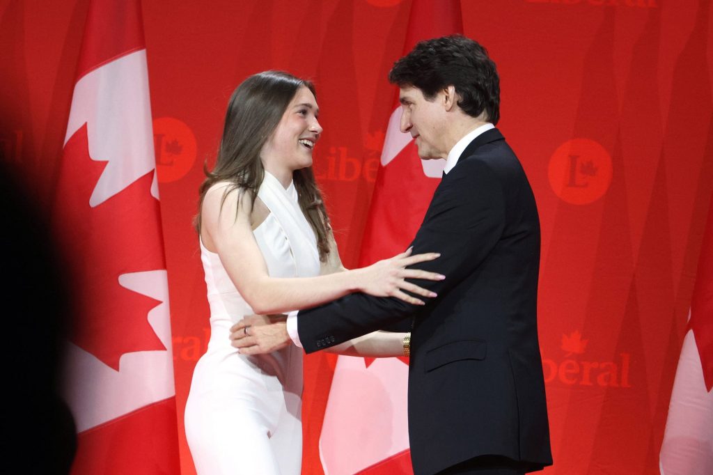 Ella-Grace Trudeau, left, introduces her father Justin Trudeau ahead of his final speech as Liberal leader. She told the crowd that she and her two brothers shared him with Canada for the last 12 years, and ‘we’re taking him back.’ The Hill Times photograph by Sam Garcia