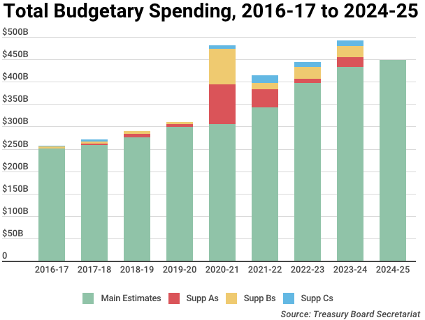 By contrast, the 2023-24 mains laid out a total of $432.9-billion in budgetary spending (of which $198.2-billion was voted on) and roughly $269.4-million in non-budgetary spending.