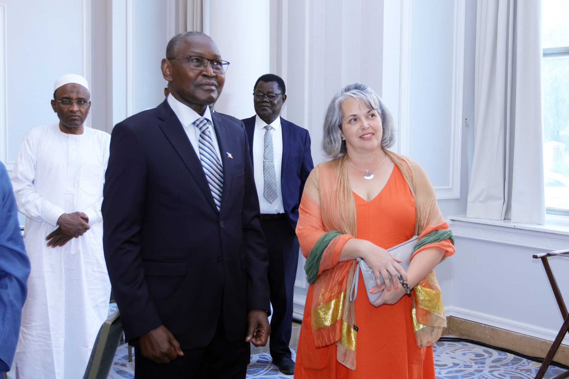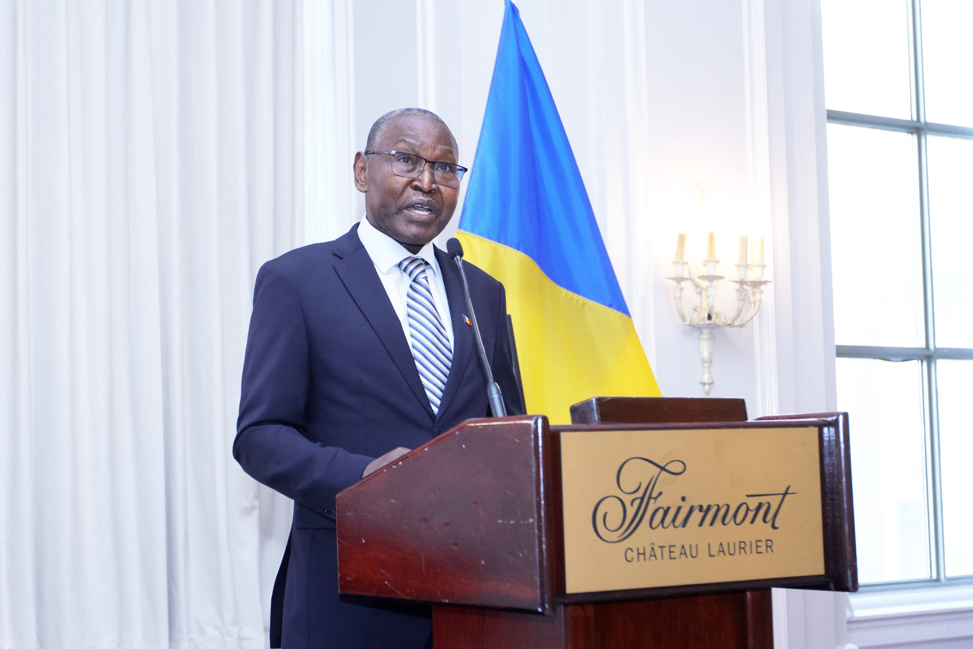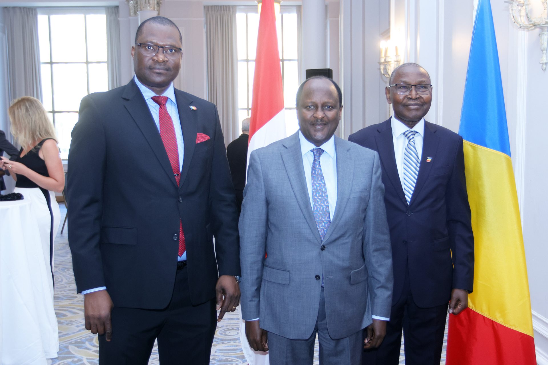 Naloum, left, and Canadian Ambassador-designate to Chad Marie-Claude Harvey. The Hill Times photograph by Sam GarciaChad Ambassador Bouroumdou Naloum gives a speech at a reception to mark his country’s national day at the Château Laurier on Aug. 11. The Hill Times photograph by Sam GarciaMayara Kadingar, first secretary at the Embassy of Chad, left; High Commissioner of Tanzania Joseph Sokoine; and Naloum. The Hill Times photograph by Sam Garcia