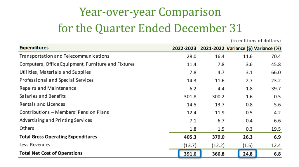 Other line items that saw double-digit increases were utilities, materials, and supplies (66 per cent increase to $7.8-million), computers and office equipment (46 per cent increase to $11.4-million), repairs and maintenance (40 per cent increase to $6.2-million), and professional and special services (23 per cent increase to $14.3-million).