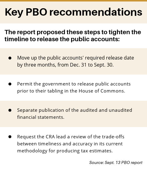 Finally, the PBO recommends the government amend the Financial Administration Act so Ottawa is legally required to release the accounts by Sept. 30.