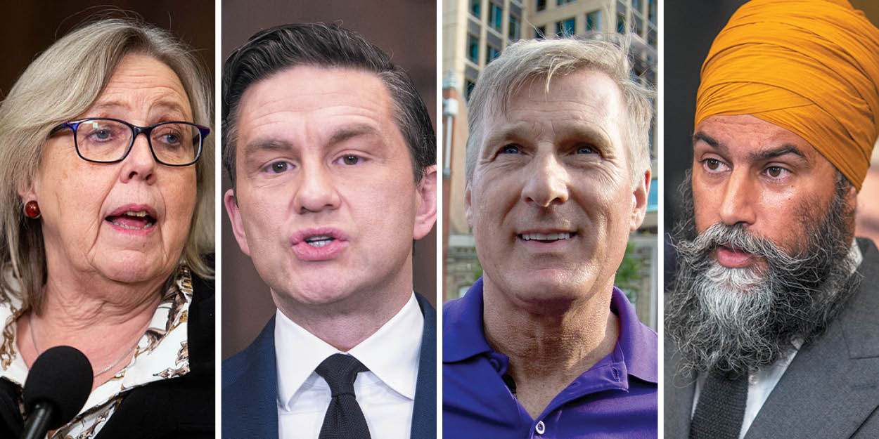 Green Party Leader Elizabeth May, left, Conservative Leader Pierre Poilievre, People's Party Leader Maxime Bernier, and NDP Leader Jagmeet Singh. A wholesale change in party leadership would be good for Canada, writes Bhagwant Sandhu.