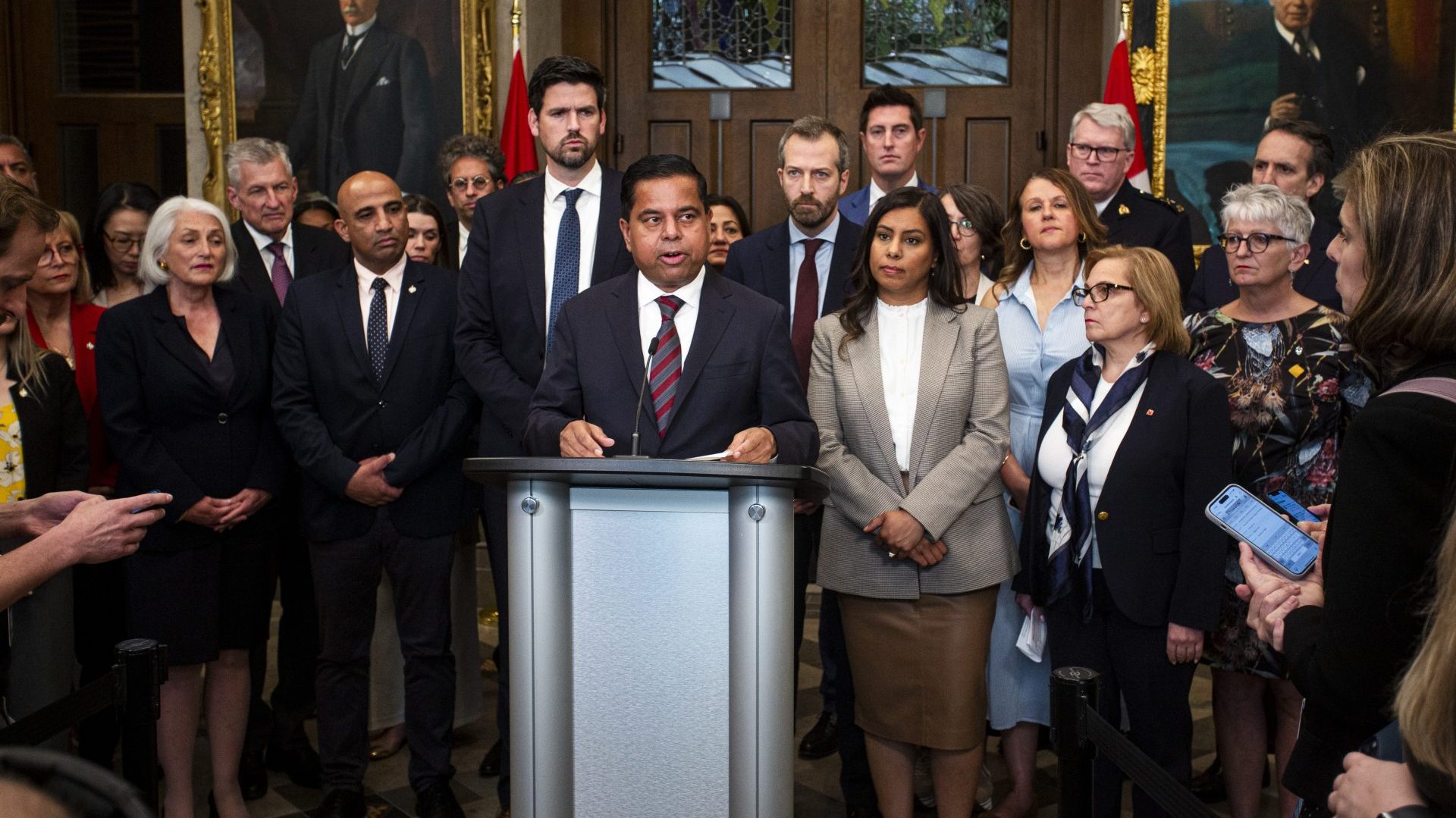 Public Safety Minister Gary Anandasangaree, centre, announces the tabling of the Strong Borders Act, which would expand the Coast Guard’s mandate, on June 3. The Hill Times photograph by Andrew Meade