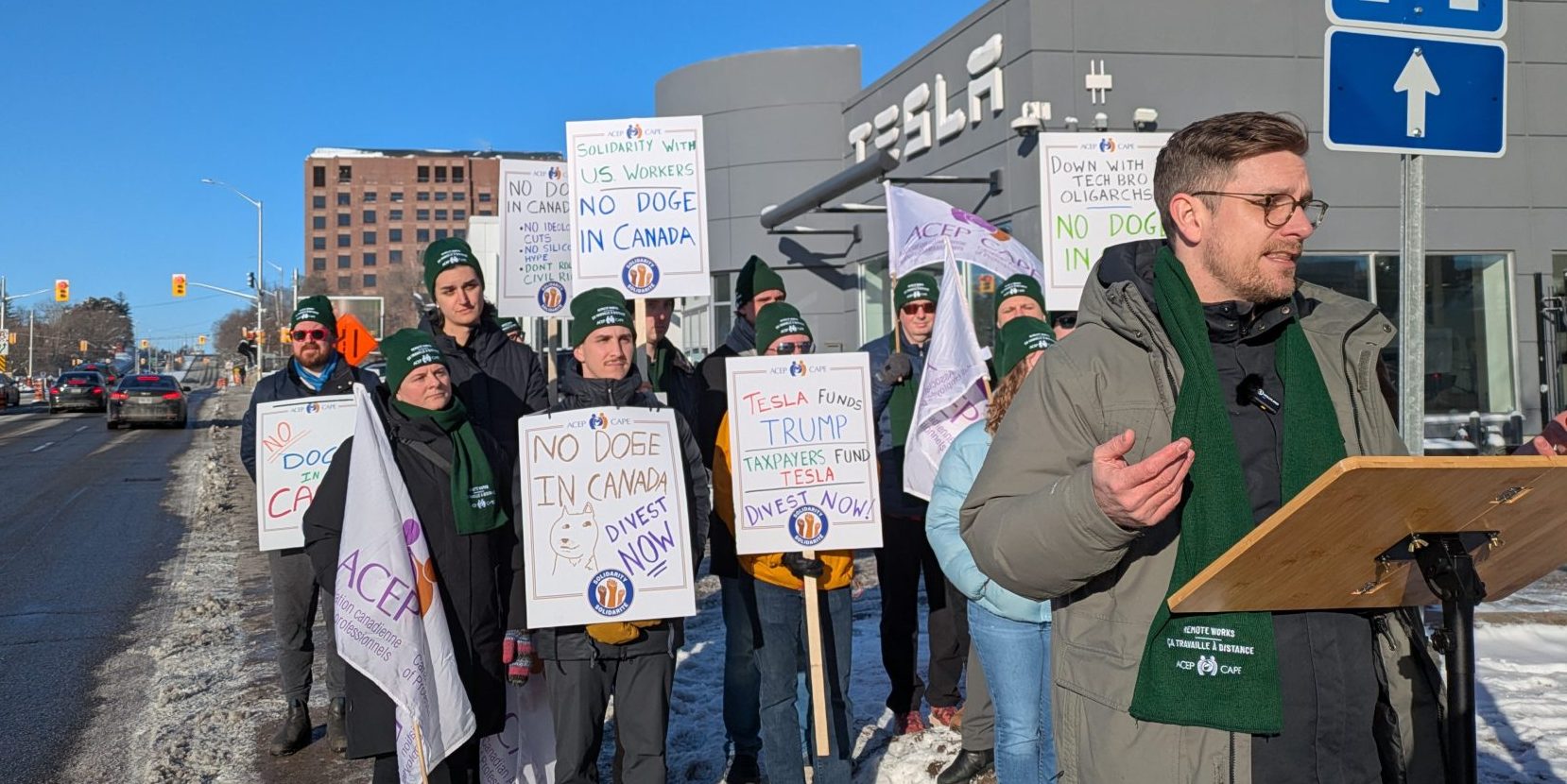 Speaking outside an Ottawa Tesla dealership with about a dozen CAPE members on April 9, CAPE president Nathan Prier said the union’s demand was also in solidarity with American public servants subject to mass layoffs and uncertainty as a result of DOGE.