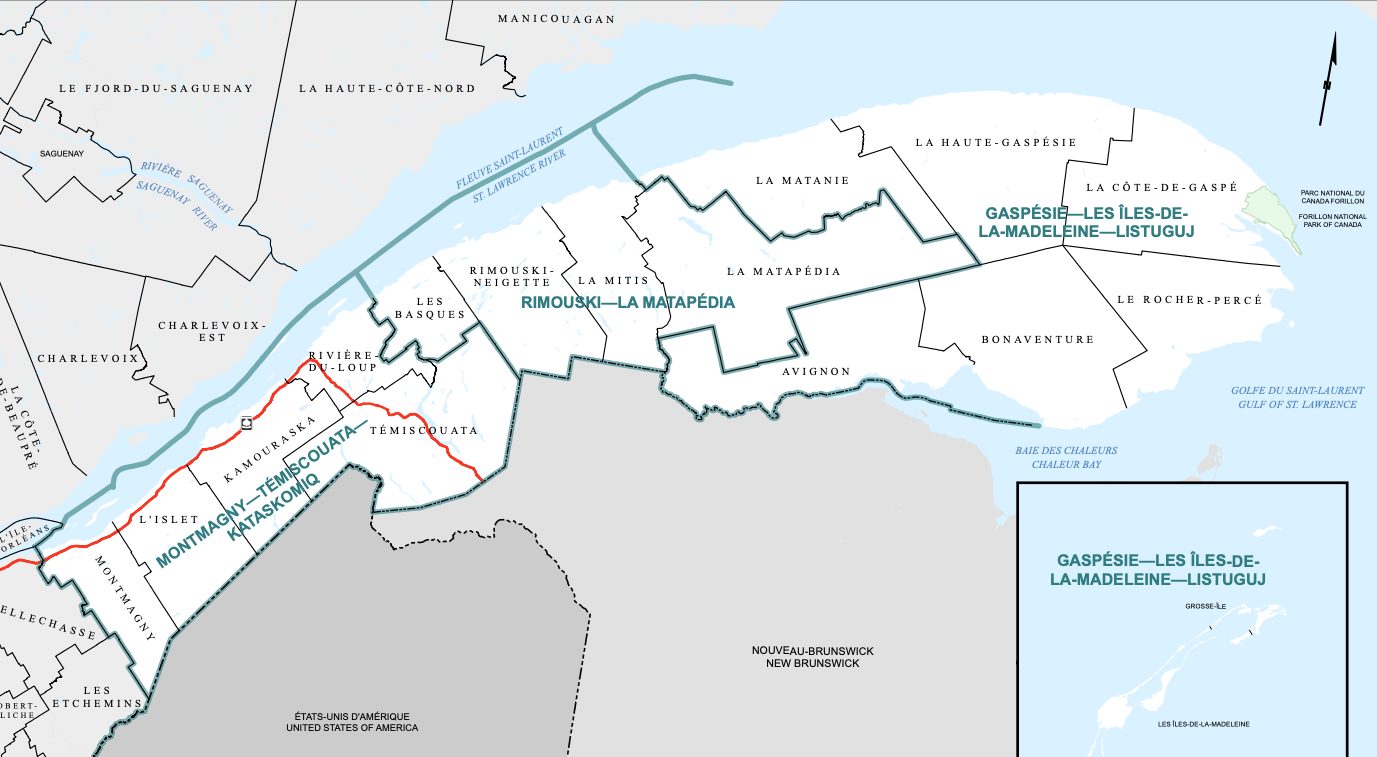 As put forward in the initial draft published in late July, the riding is set to have its eastern end absorbed by Gaspésie–Les Îles-de-la-Madeleine—currently represented by National Revenue Minister Diane Lebouthillier—which would pick up the regional county municipalities (RCMs) of La Matanie and Avignon. The initial proposal also had the Gaspésie riding pick up the RCM of La Matapédia, but the final version has La Matapédia, along with La Mitis, instead combined with the eastern half—made up of the RCMs of Les Basques and Rimouski-Neigette—of the current riding of Rimouski-Neigette–Témiscouata–Les Basques, which would be renamed Rimouski–La Matapédia. Témiscouata would join the RCMs of Rivière-du-Loup, Kamouraska, L’Islet, and Montmagny to form Montmagny–Témiscouata–Kataskomiq.