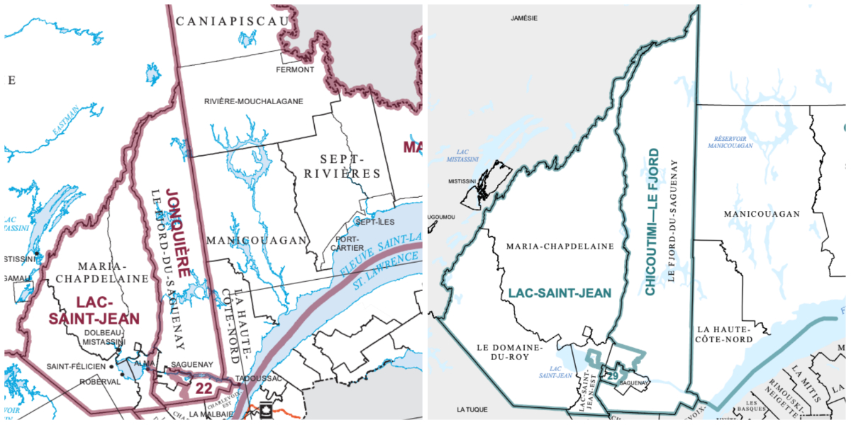 The current riding of Jonquière stretches north from the city to include all of the RCM of Le Fjord-du-Saguenay that’s north of the Saguenay River, with the smaller riding of Chicoutimi–Le Fjord capturing south of the river. The new version of Chicoutimi–Le Fjord would encompass almost the entire RCM, north and south of the river (aside from a small chunk being added to Lac-Saint-Jean).