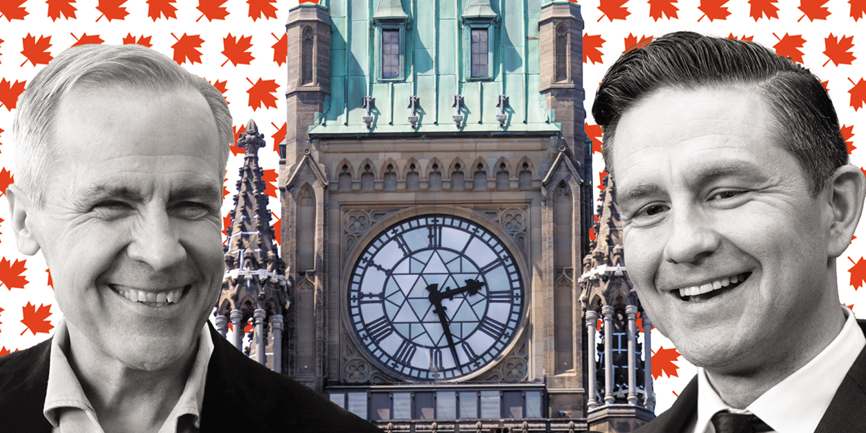 Liberal leadership candidate Mark Carney, left, would bring his party to a dead heat against the Conservative Party under leader Pierre Poilievre, right, a new Leger poll suggests, amid growing Canadian anger at U.S. President Donald Trump.
