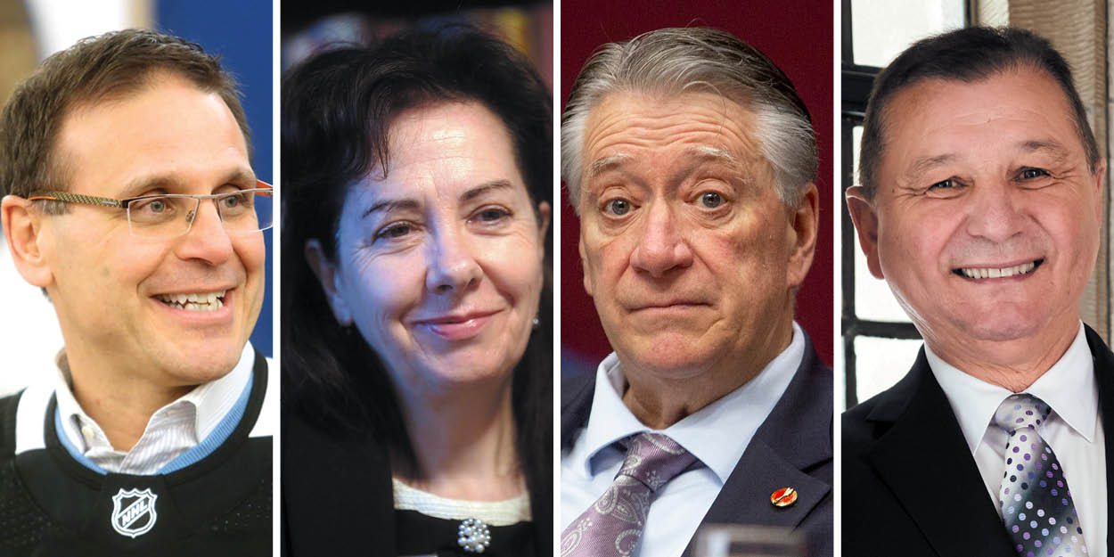 New Senate Conservative Leader Leo Housakos, left, returning Independent Senators Group Facilitator Raymonde Saint-Germain, returning Canadian Senator Group Leader Scott Tannas, and newly elected Progressive Senate Group Leader, Brian Francis.