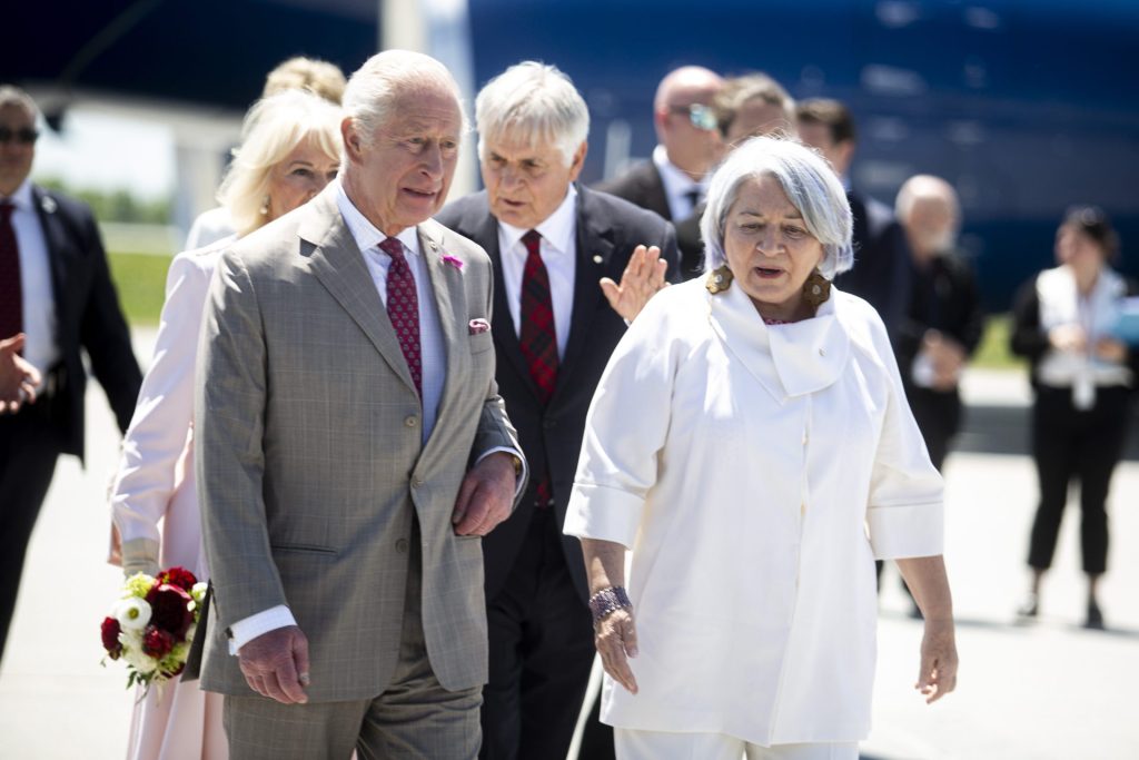 King Charles, left, and his representative in Canada, Governor General Mary Simon leave the tarmac after his arrival on May 26. The Hill Times photograph by Andrew Meade