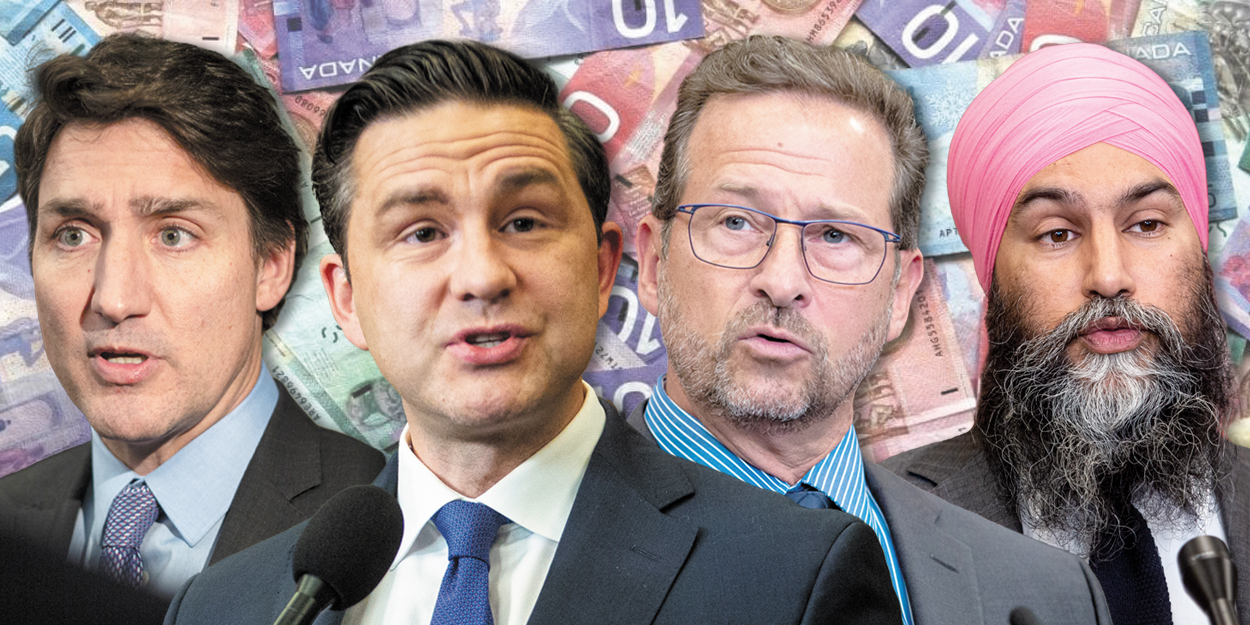 The Conservative Party has raised more than $65-million since Pierre Poilievre, second left, became leader in September 2022, including more than $20-million in the first half of 2024, which is $9-million more than the parties of Liberal Prime Minister Justin Trudeau, left, Bloc Québécois Leader Yves-François Blanchet, and NDP Leader Jagmeet Singh.