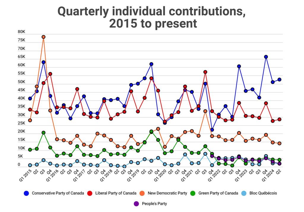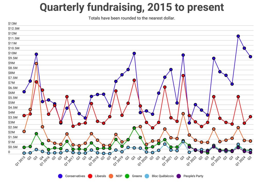 Similarly, the Conservatives’ fundraising has surged since late 2022, riding on the momentum of Poilievre’s elevation to leader of the party.