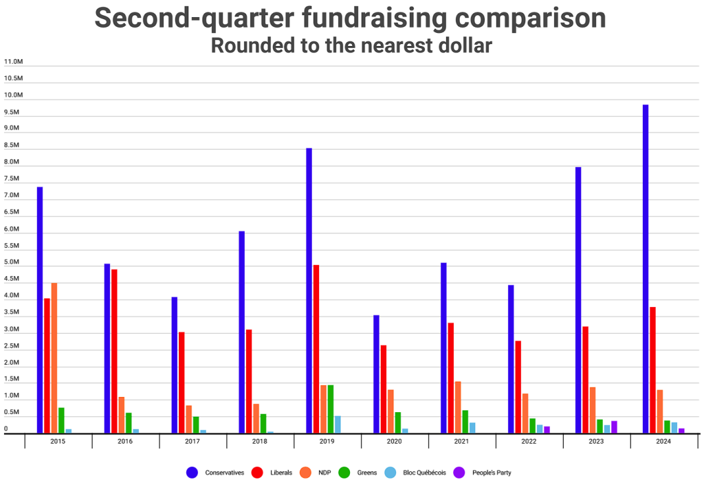 The Conservative Party raised more than $20.5-million in the first half of 2024, outpacing the governing Liberals’ fundraising by more than $13.6-million so far this year, and its own total by this point last year—a record-smashing four quarters for the official opposition—by more than $4-million.
