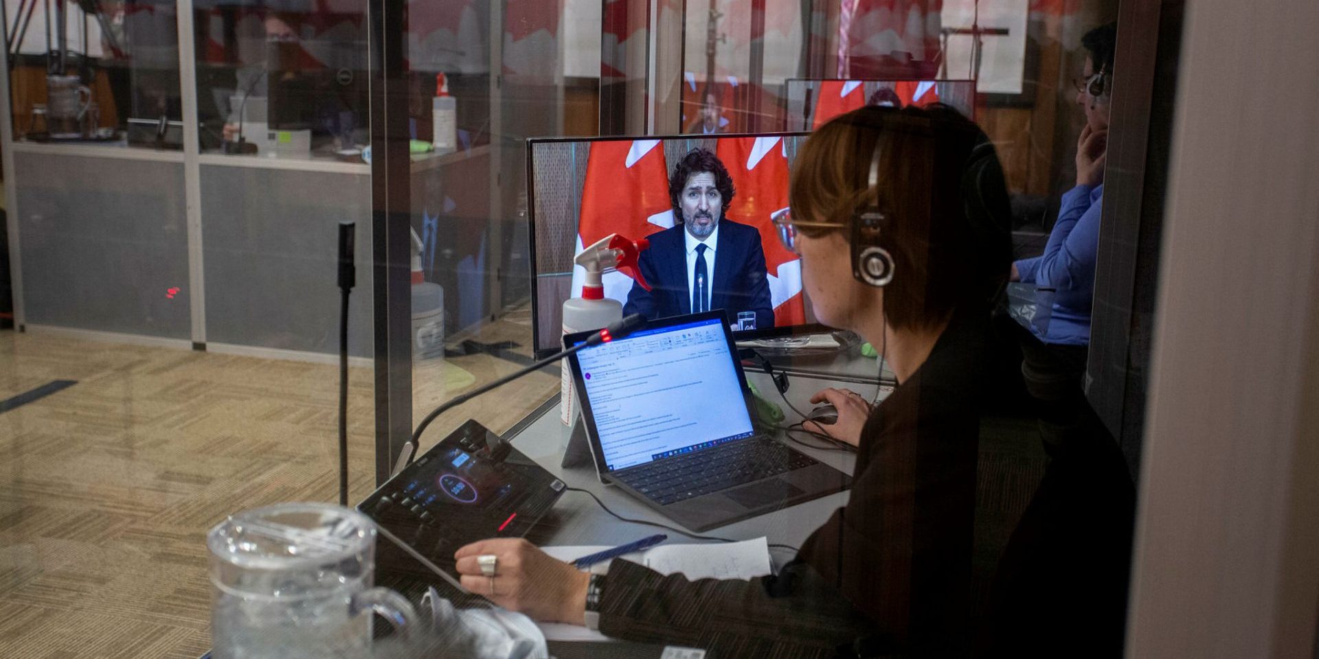 An interpreter at work in the Sir John A. Macdonald Building during a press conference with Prime Minister Justin Trudeau in February 2021.
