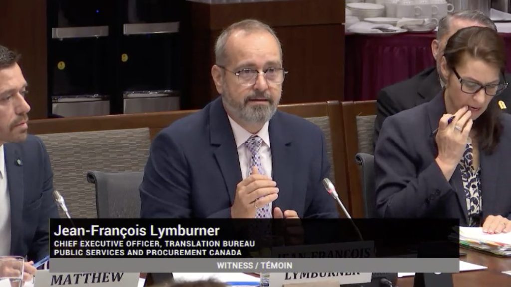 Representatives from the Translation Bureau, including chief executive officer Jean-François Lymburner, centre, appeared before the Senate Internal Economy Committee on May 23. Screenshot courtesy of SenVu
