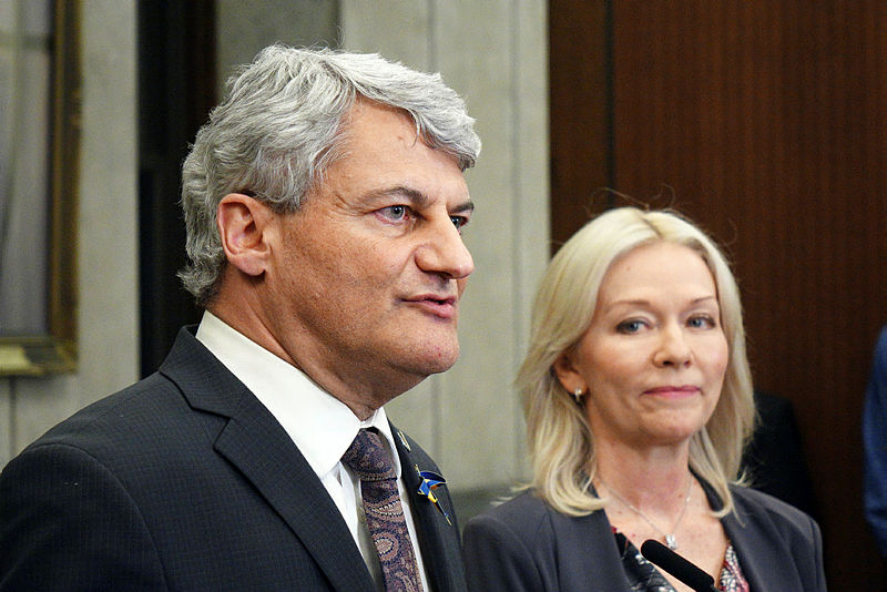 Conservative MP Gérard Deltell, left, pictured with Conservative MP Candice Bergen in the Commons foyer, says the score board for the Liberal government is ‘anything but good,’ when it comes to climate change. The Hill Times photograph by Sam Garcia