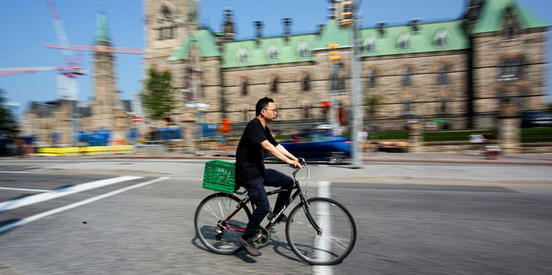 A cyclist rides past the Parliament Hill in downtown in Ottawa on Aug. 7, 2025.
