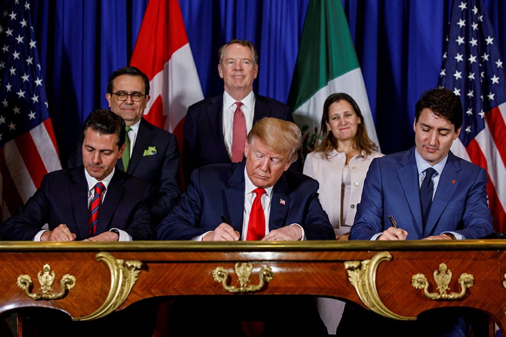 Then-Mexican President Enrique Pena Nieto, left, U.S. President Donald Trump, and Prime Minister Justin Trudeau sign the renegotiated NAFTA on Nov. 30, 2018. Prime Minister’s Office photograph by Adam Scotti