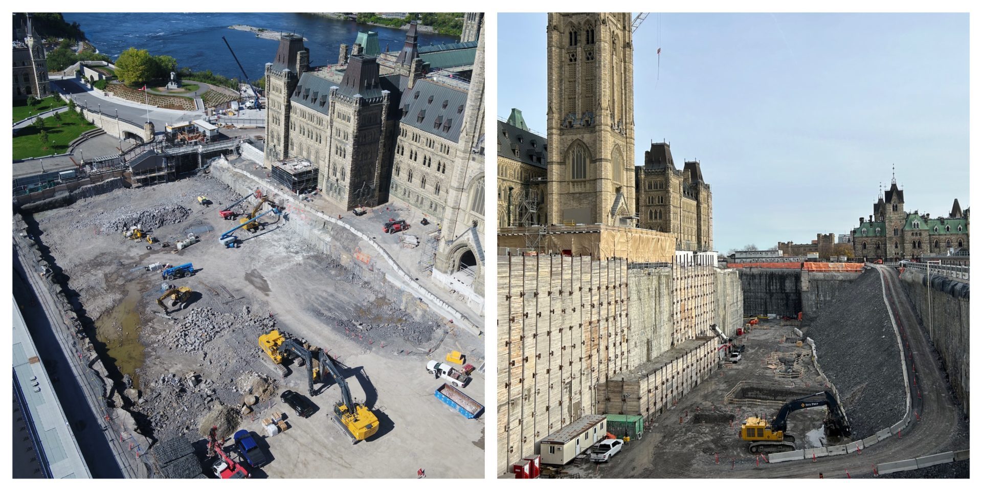 The $4.5- to $5-billion Centre Block rehabilitation project includes the construction of a new underground Parliament Welcome Centre, excavation for which is now complete and involved the removal of approximately 40,000 truckloads of bedrock, according to PSPC. The pit for the welcome centre is roughly 23-metres deep, and the complex itself is set to add roughly 32,000 square metres of new space.